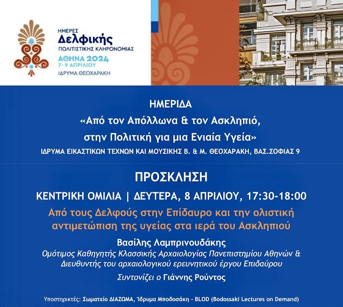 Οι εκδηλώσεις του θεσμού “Ημέρες Δελφικής Πολιτιστικής Κληρονομιάς 2024”, που θα αναπτυχθούν κατά το τριήμερο 7, 8 και 9 Απριλίου, εφέτος εστιάζουν στην στην Υγεία. Κατά τη δεύτερη ημέρα, κεντρική είναι η παρουσίαση του θέματος “Από τους Δελφούς στην Επίδαυρο και την ολιστική αντιμετώπιση της Υγείας στα ιερά του Ασκληπιού” από τον Βασίλη Λαμπρινουδάκη, ομότιμο καθηγητή Κλασσικής Αρχαιολογίας του Πανεπιστημίου Αθηνών και Διευθυντή του αρχαιολογικού ερευνητικού έργου στην Επίδαυρο.